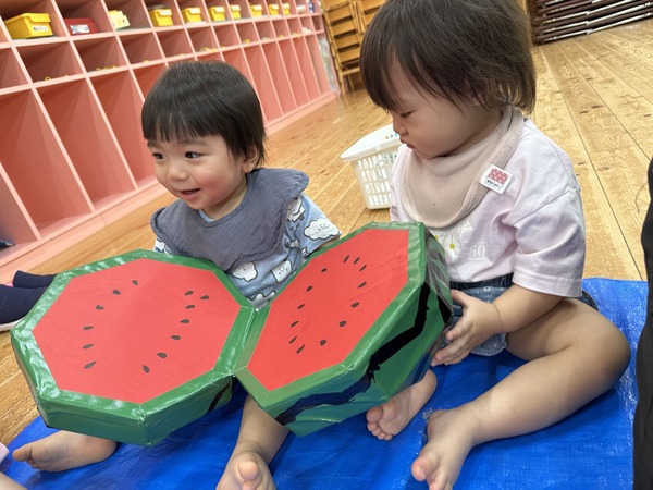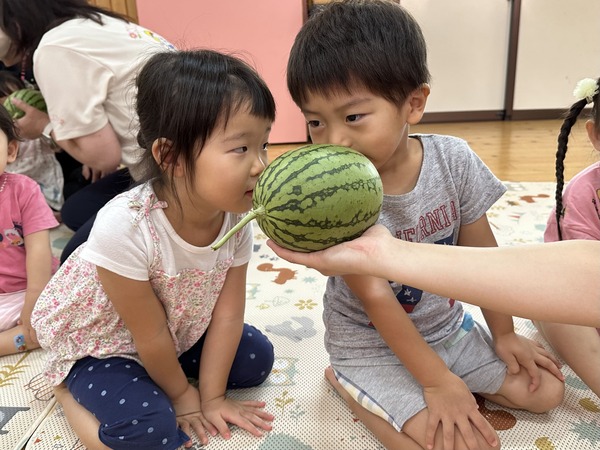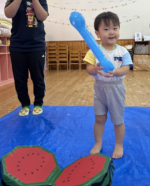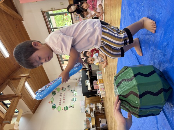 実際に触れたり匂いを嗅いだりした後は、段ボールで作ったスイカでスイカ割りを楽しみました♪
