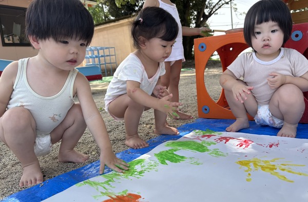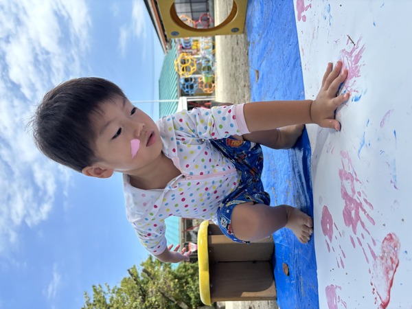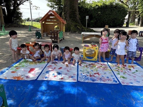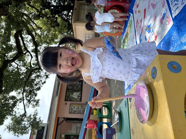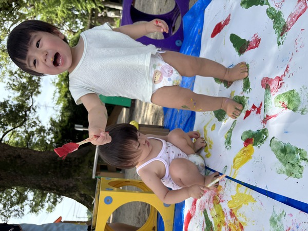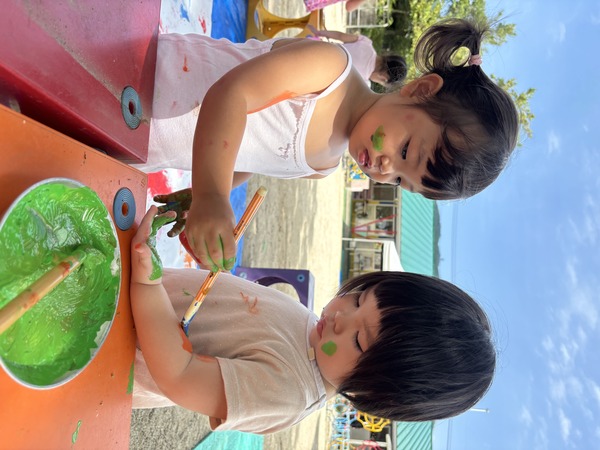 友だち同士で絵の具を付け合ったり、絵の具を混ぜると色の変化にびっくりしたりしながら、夏ならではの遊びを楽しむことができました♪