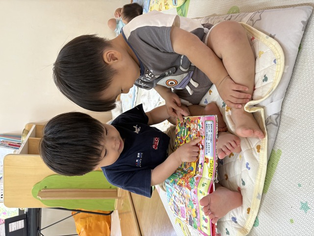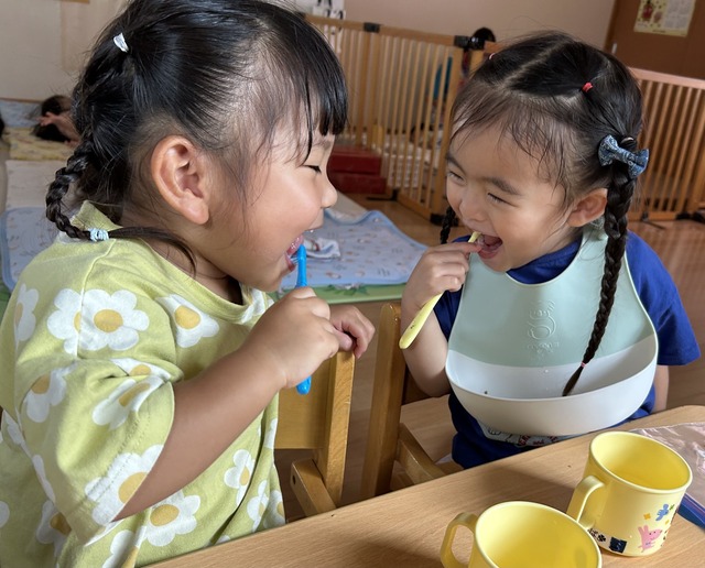 9:00 | 【排泄・朝のおやつ・朝のお集まり】 ○排泄:子どもたちの成長に合わせて、オマルやトイレの練習をしています。 ○朝のおやつ・朝のお集まり:朝のおやつを食べた後は、みんなで朝の歌や季節の歌をうたったり、お返事ハイをしたりします。 |